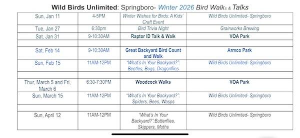Join us on a bird walk or an in-store TALK! The latest schedule of walks and talks by Wild Birds Unlimited of Springboro, Ohio follows. Be sure to check out the location for each event on the schedule.