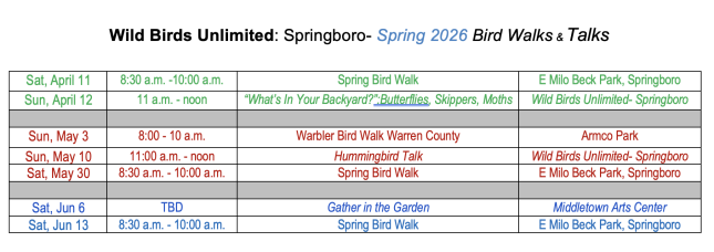 Join us on a bird walk or an in-store TALK! The latest schedule of walks and talks by Wild Birds Unlimited of Springboro, Ohio follows. Be sure to check out the location for each event on the schedule.